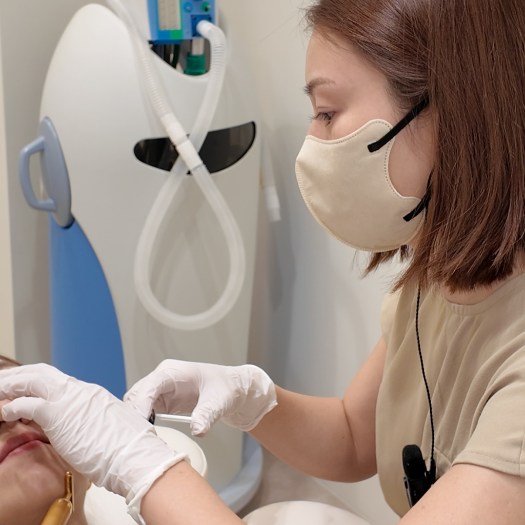 パウダールームで洗顔いただいた後、必要に応じて麻酔クリームを塗布します。医師が34Gの極細針を用い、一箇所ずつ丁寧に手打ちで注入。痛みや体調に配慮しながら、進捗を鏡で確認いただくことも可能です。